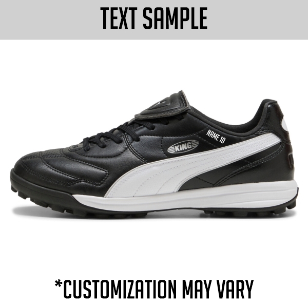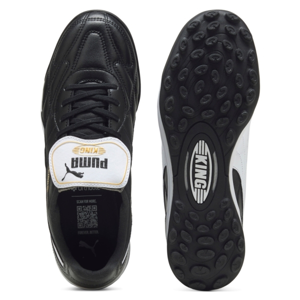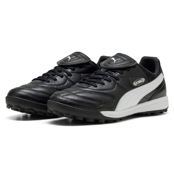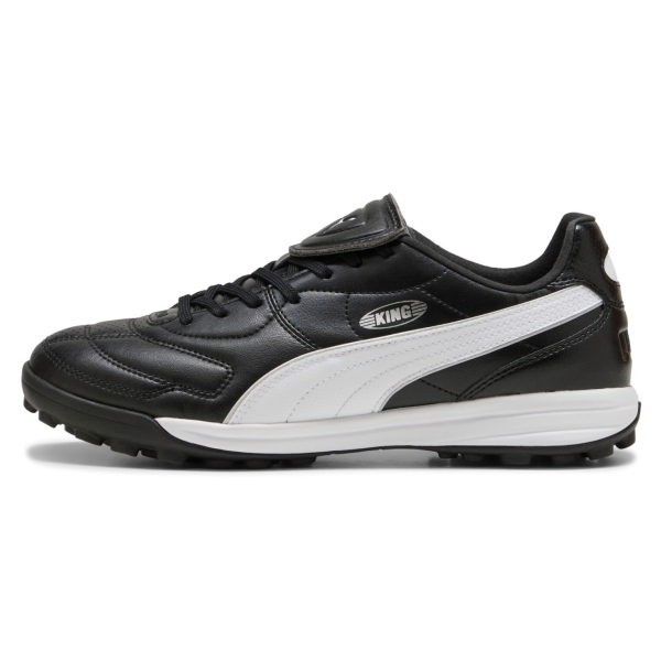 Our Puma King Liga TF - Black/White/Silver Turf Shoes combines classic KING elements, such as the fold-over tongue and deco stitching, with a completely re-engineered modern lightweight outsole and a new, non-animal based Soft Touch material for the upper. Retro KING branding adds the finishing touch.