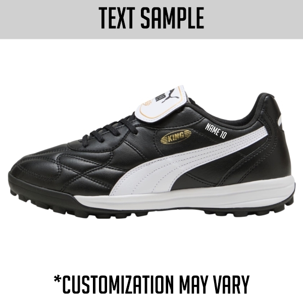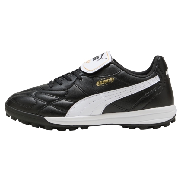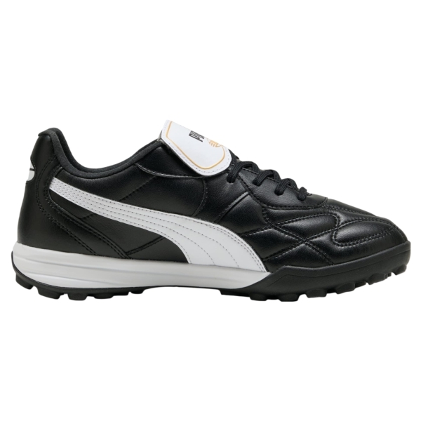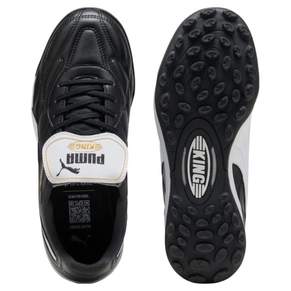 Our Puma King Top TF - Black/White Turf Shoes combines classic KING elements, such as the fold-over tongue and deco stitching, with a completely re-engineered lightweight outsole and a new, non-animal-based K-BETTER material for the upper. Retro KING branding adds the finishing touch.