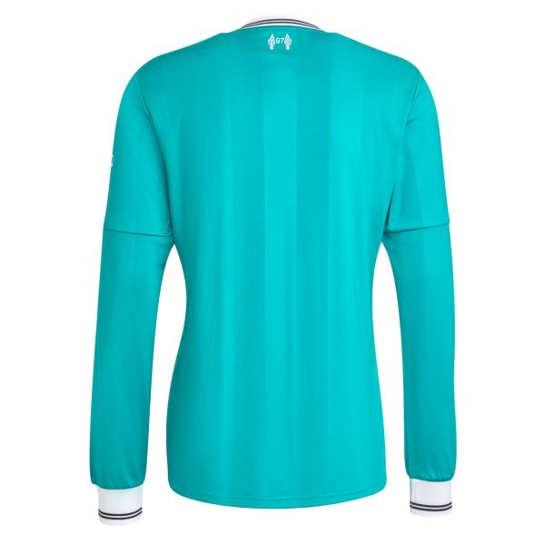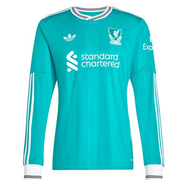Our adidas Liverpool Away Long Sleeve Jersey 2025-2026 is a modern soccer classic inspired by Liverpool FC's storied 3-Stripes history. The tonal vertical stripes on this third jersey come in unmistakable adidas Equipment green. On the chest, that vintage club badge shares the spotlight with a Trefoil for the first time since 1991. Created for traveling Reds, this long sleeve shirt includes moisture-managing AEROREADY so it feels as good as it looks.